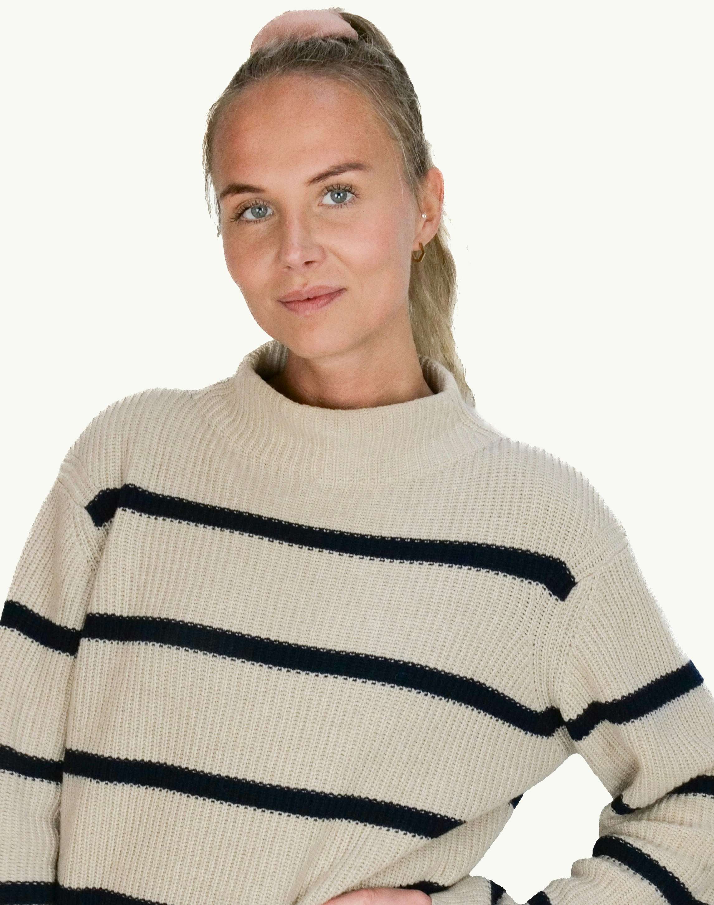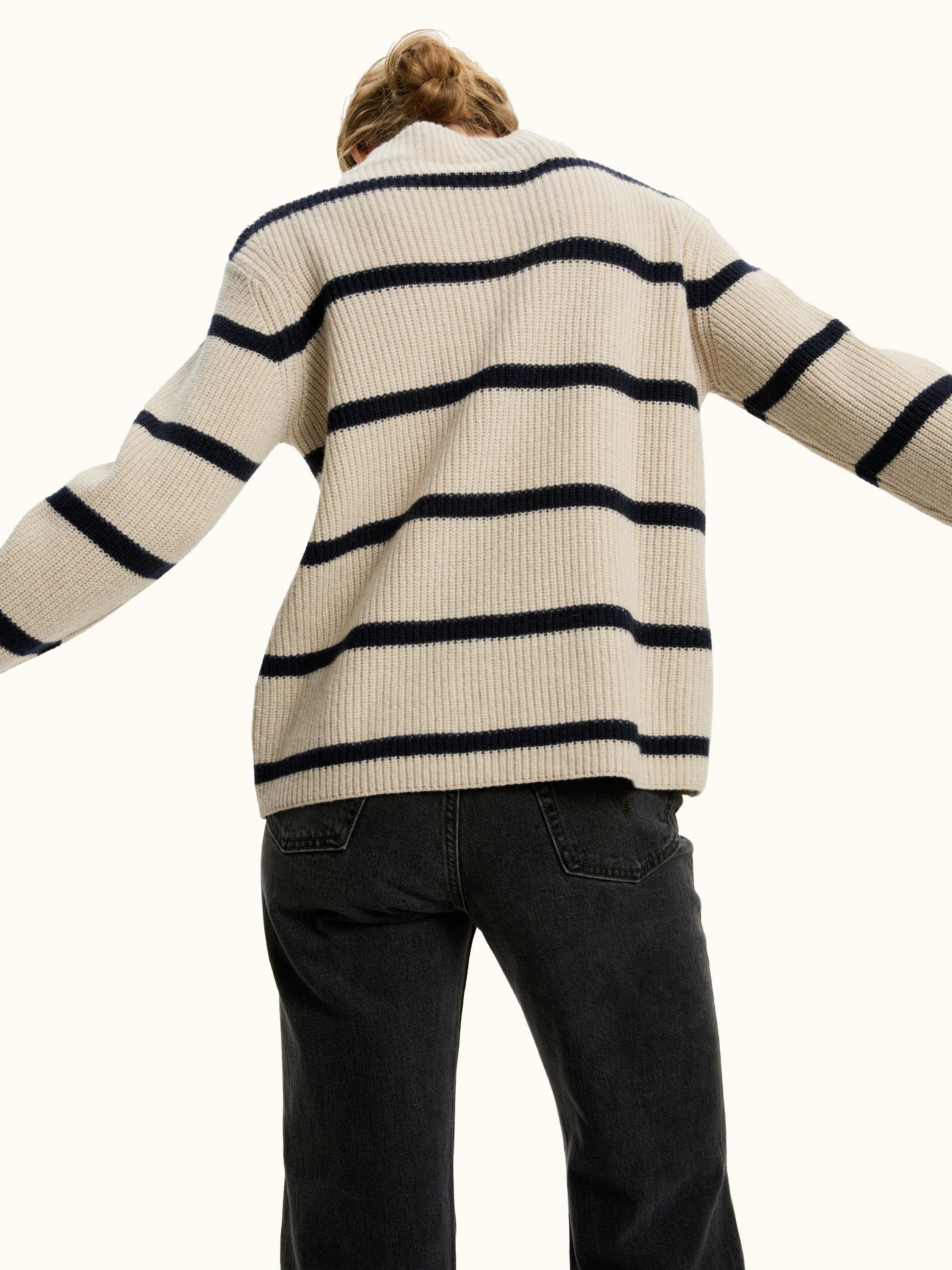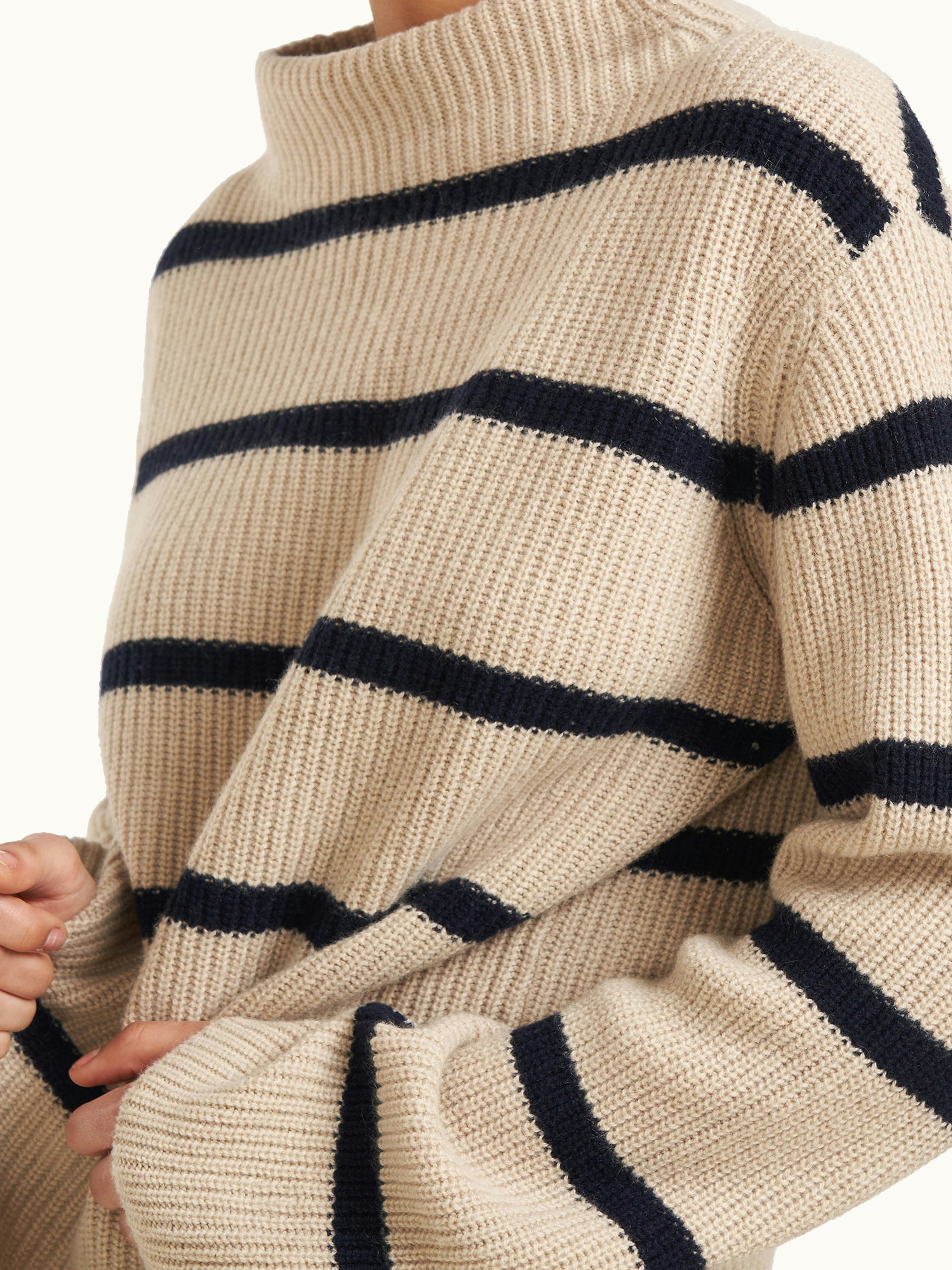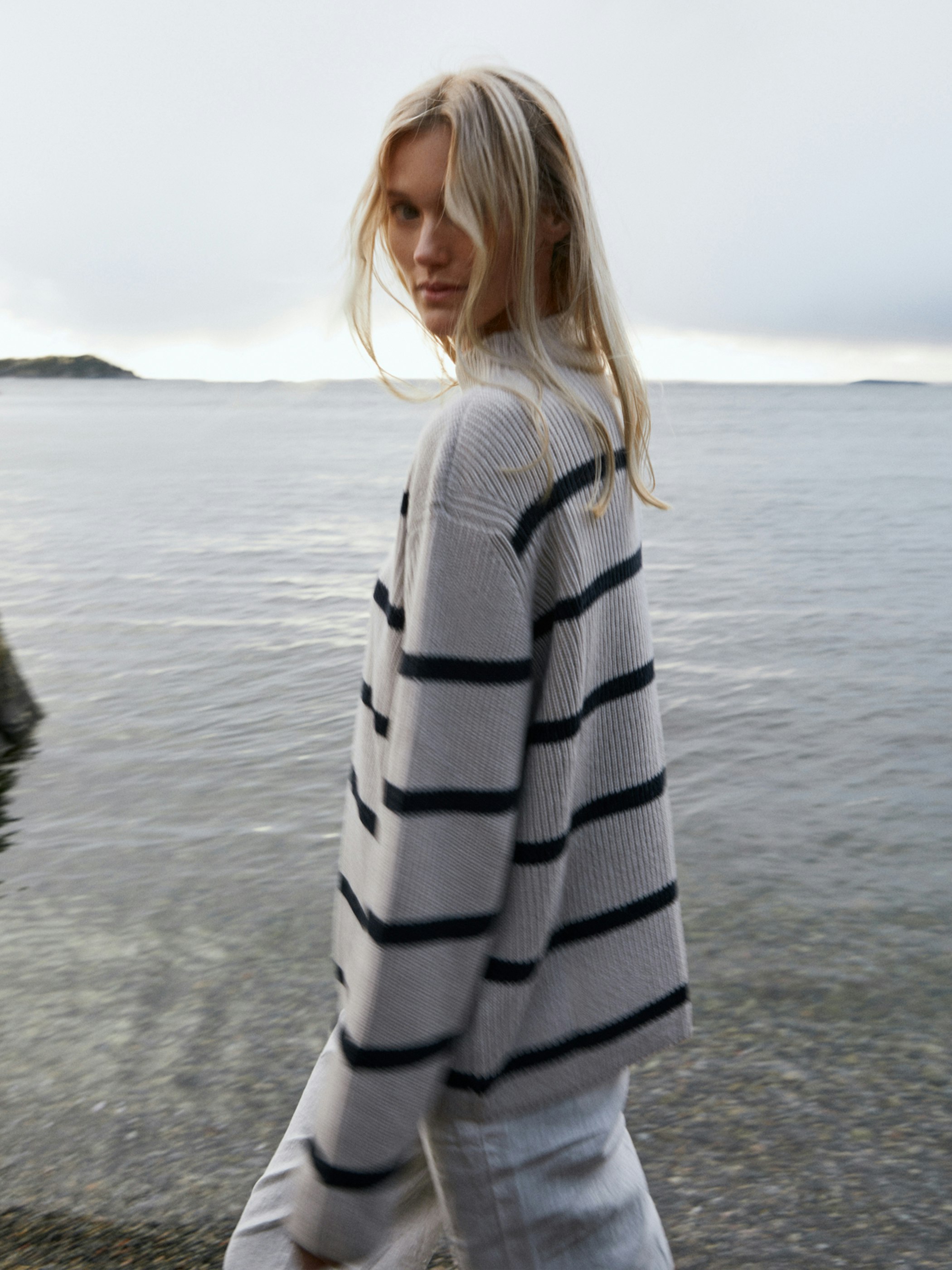 Raidallinen Arholma-kashmirneule on valmistettu pehmeästä kashmirsekoitteesta, josta suuri osa on kierrätettyä. Ympäristöä säästävä ja ilmastoystävällinen ratkaisu. Tyylikäs korkea kaulus ja suora helma tekevät puserosta ihanteellisen kerrospukeutumiseen paidan tai mekon päälle, ympäri vuoden.