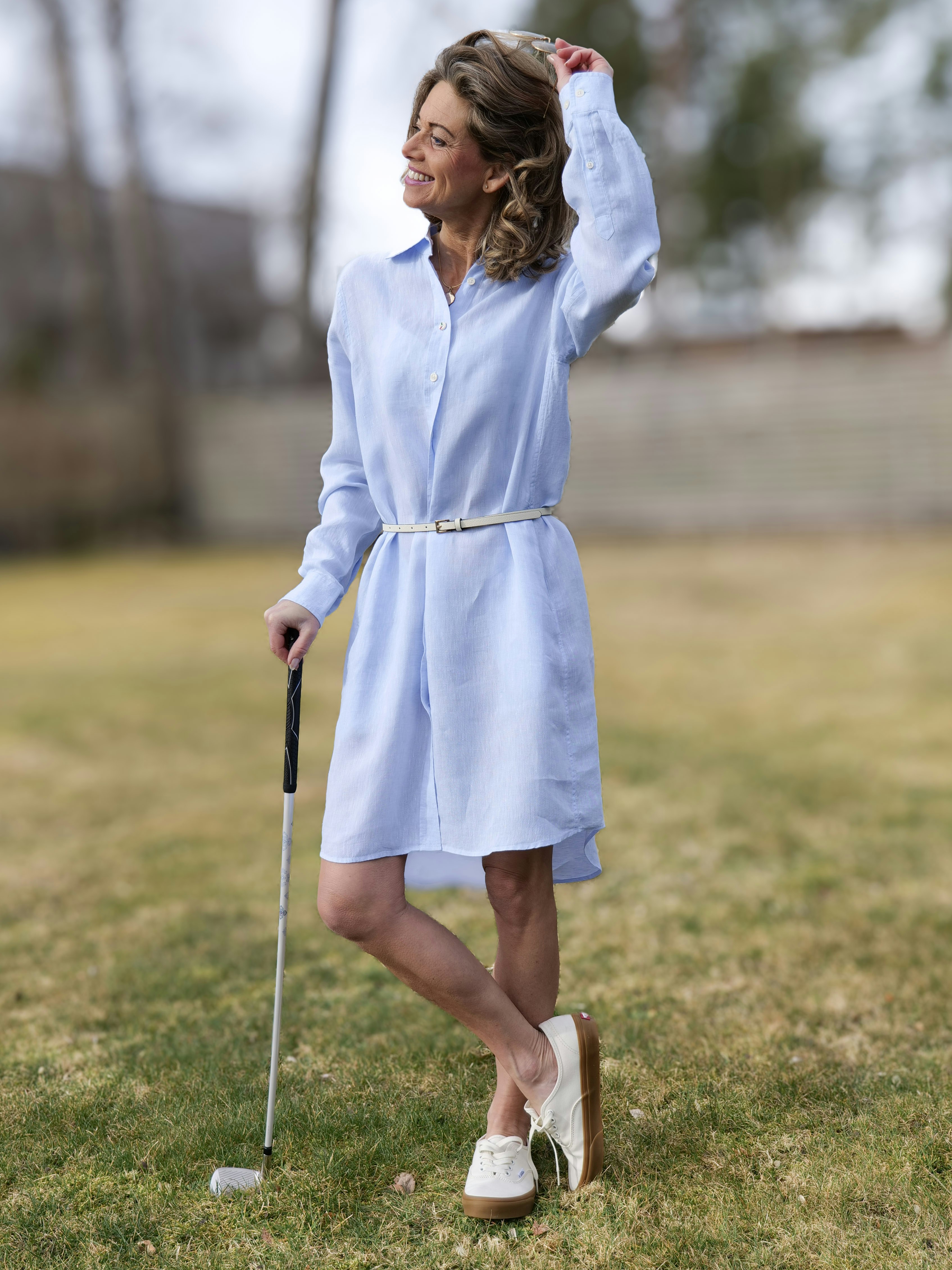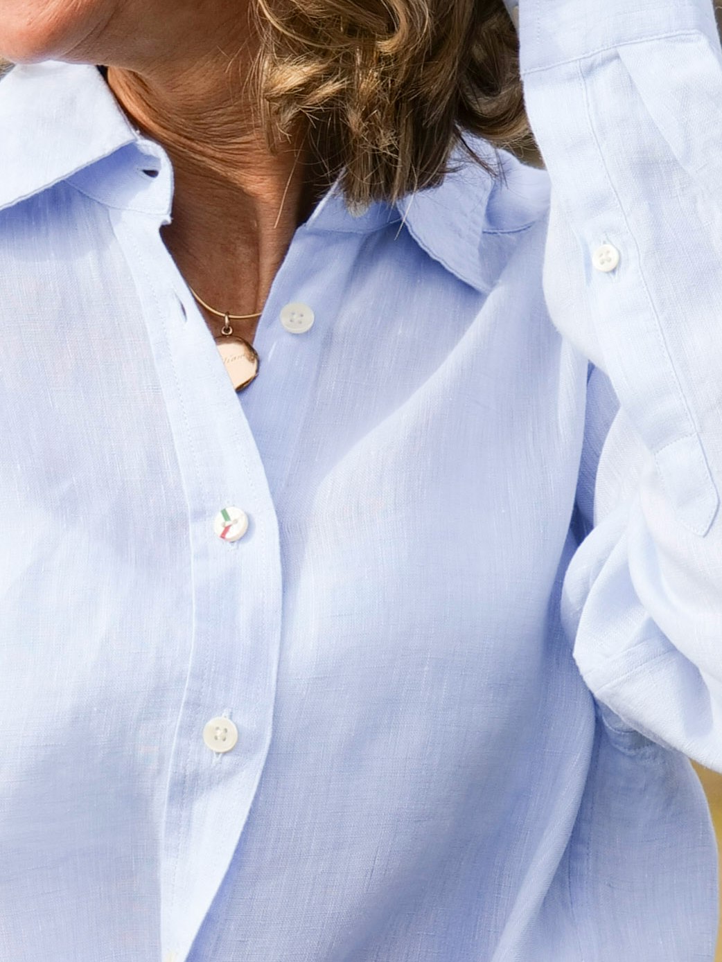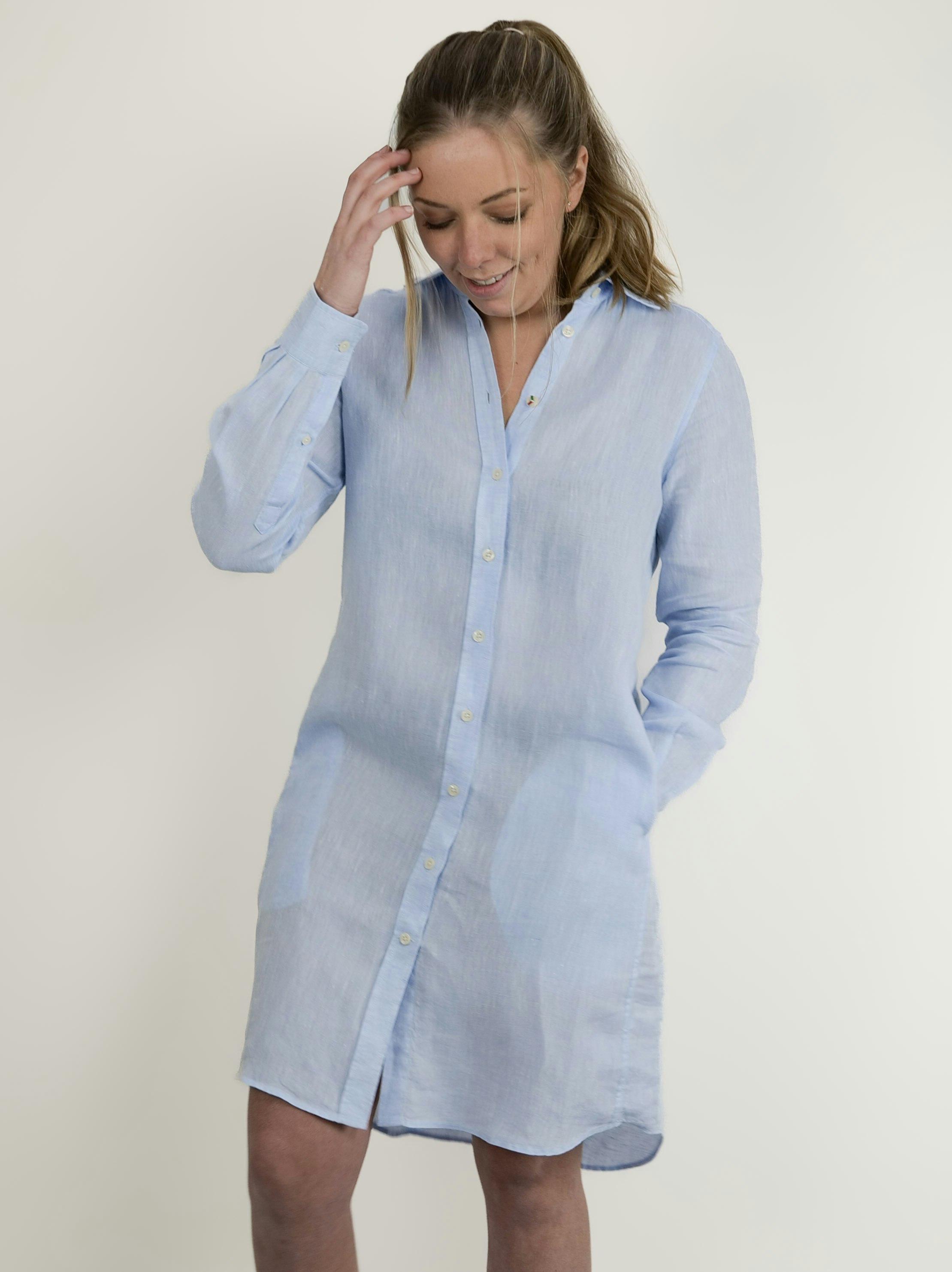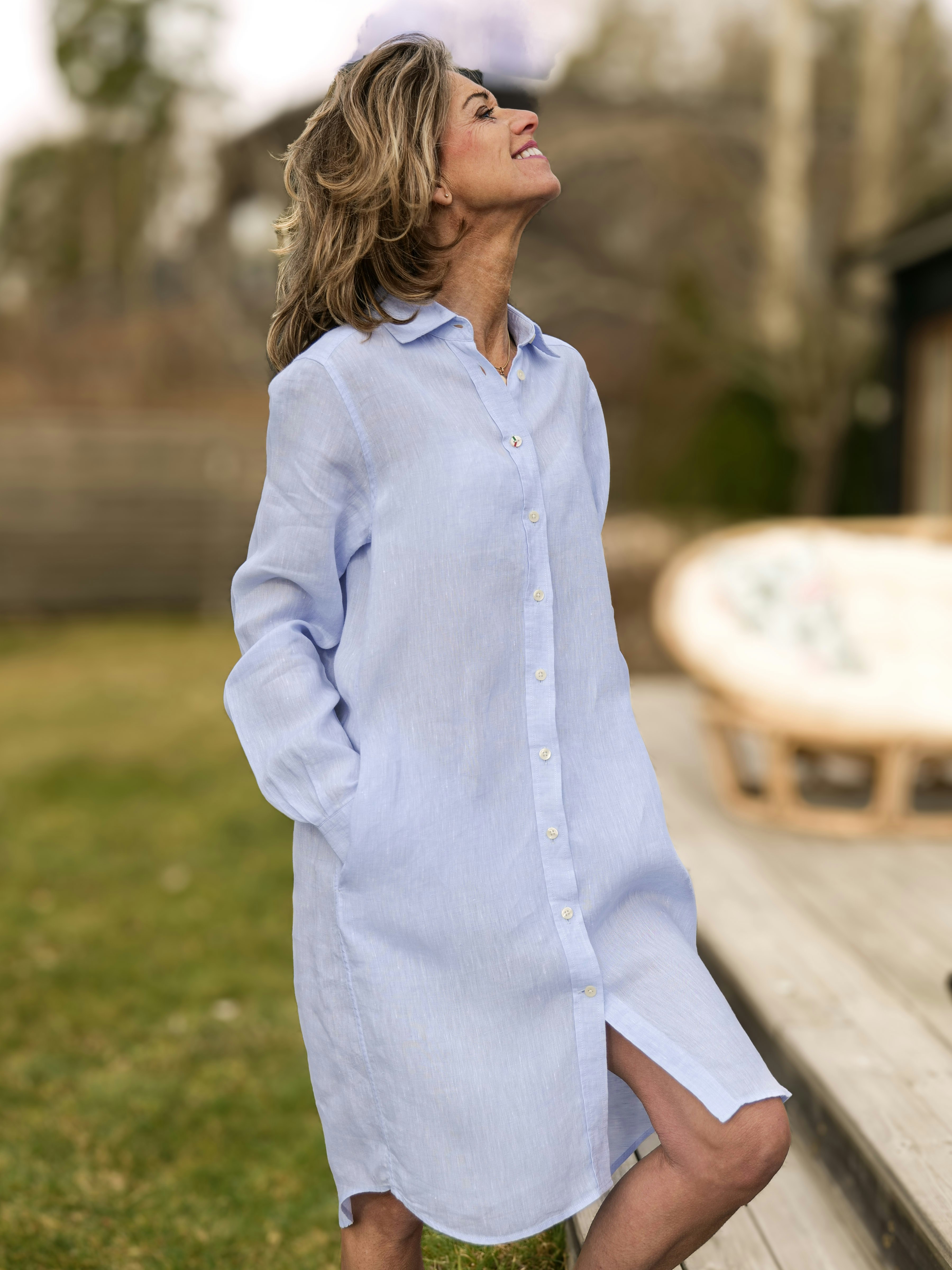 Pitkähihainen Bea-pellavamekko sopii täydellisesti saaristoon, kaupunkiin, toimistolle ja juhliin. Rento malli on valmistettu pehmeästä ja miellyttävän tuntuisesta esipestystä pellavasta. Kolmantena nappina on käsinmaalattu Boomerang-nappi yksityiskohtana, joka kuvastaa perintöämme. Mekossa on syvät sivutaskut, jotka tekevät siitä käytännöllisen päivittäisessä käytössä.