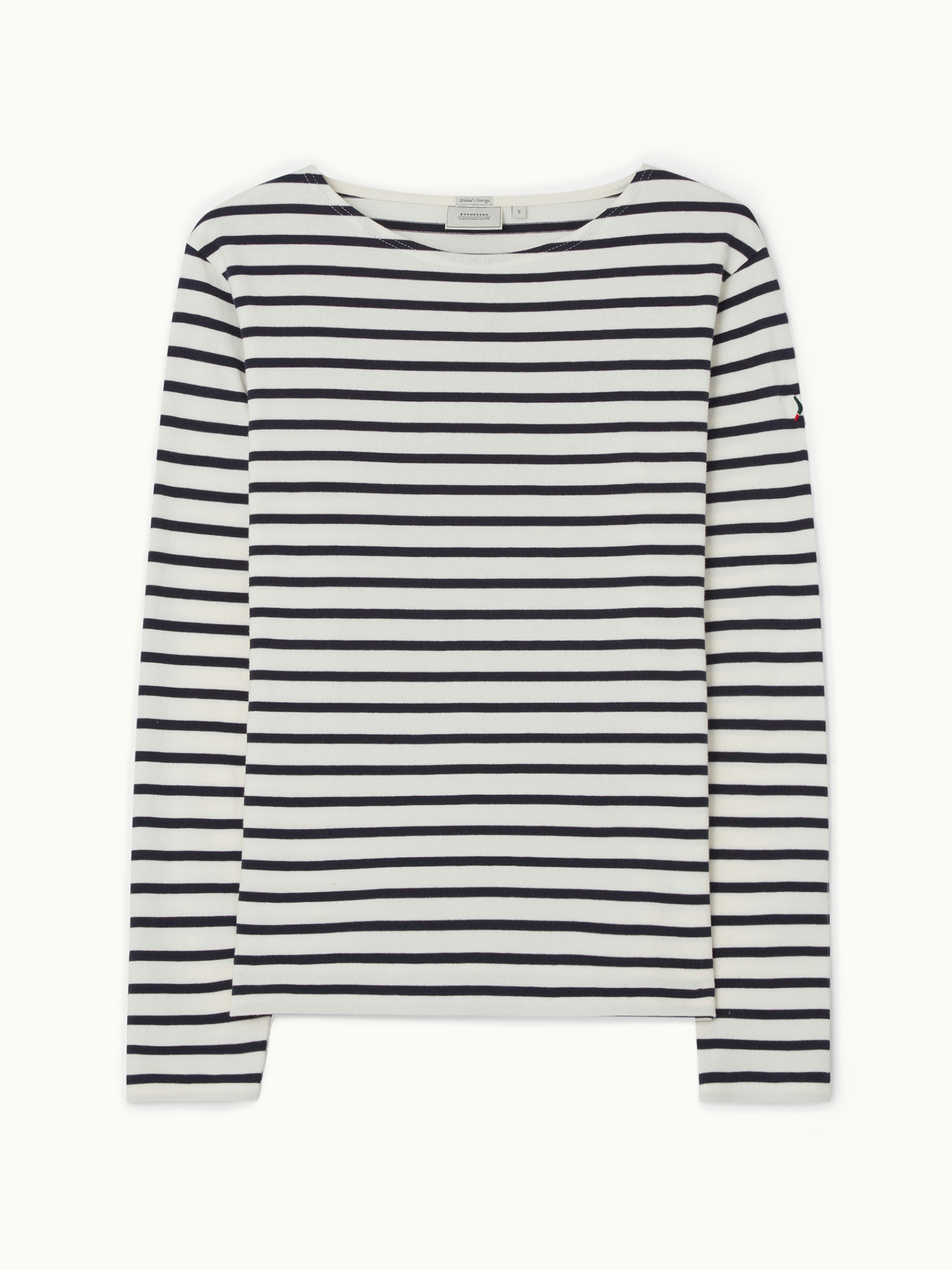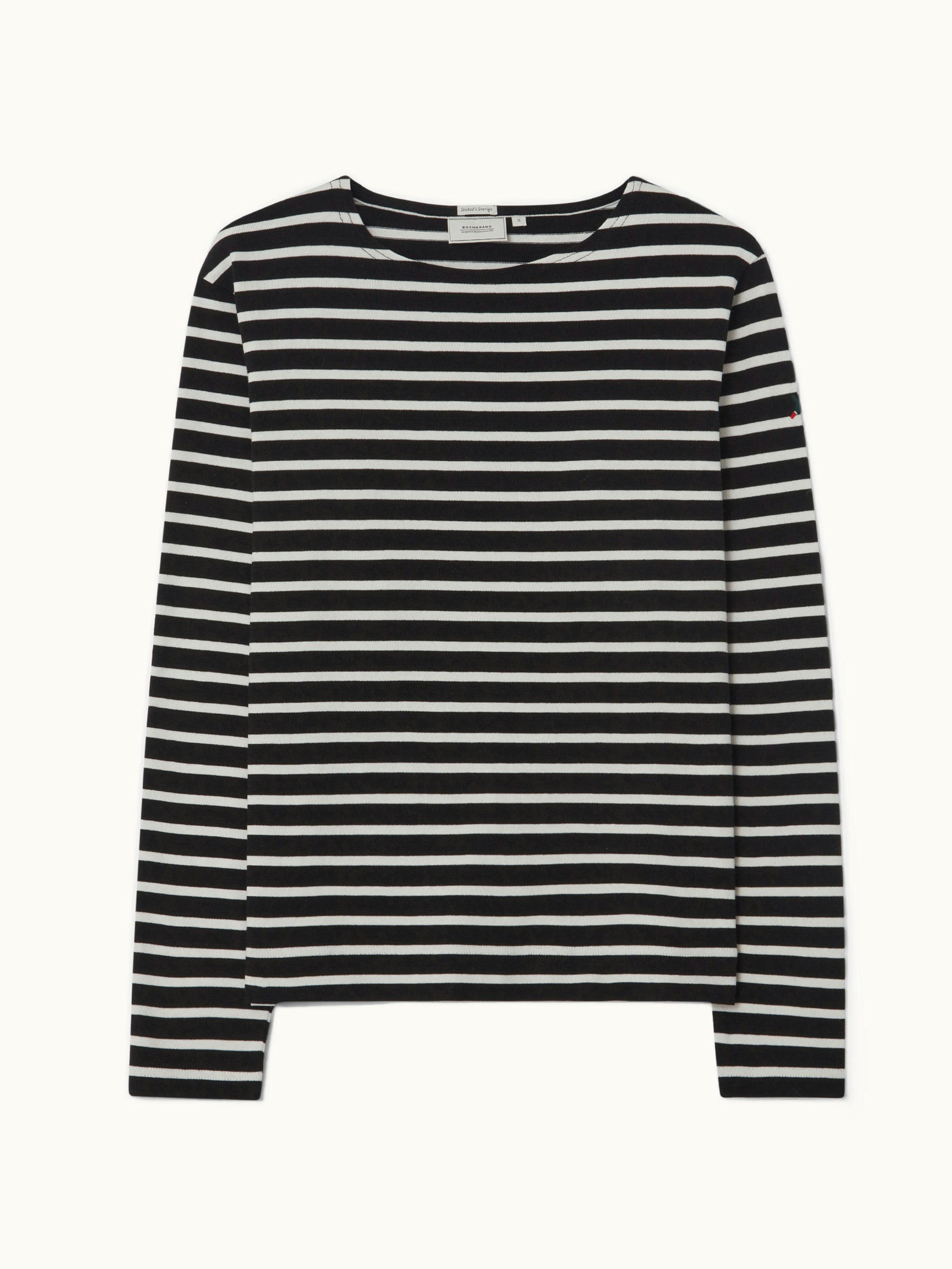 Raidallinen pitkähihainen Bolmsö-T-paita palaa takaisin suosittuna klassikkona, joka on nyt neulottu Ruotsissa. Paita on valmistettu luomupuuvillasta, joka tuntuu pehmeältä ja miellyttävältä iholla. Pelkistetty suoralinjainen malli. Erottuva elementti on kirjailtu Boomerang-logo, joka koristaa oikeaa hihaa. Perinteisten resorien jättäminen pois ja hillityn venepääntien valitseminen korostavat paidan minimalistista ja käsintehtyä luonnetta. Bolmsö on kaikkiin vuodenaikoihin sopiva monipuolinen paita, jota voi vaalia ja käyttää ilolla vuosikausia.