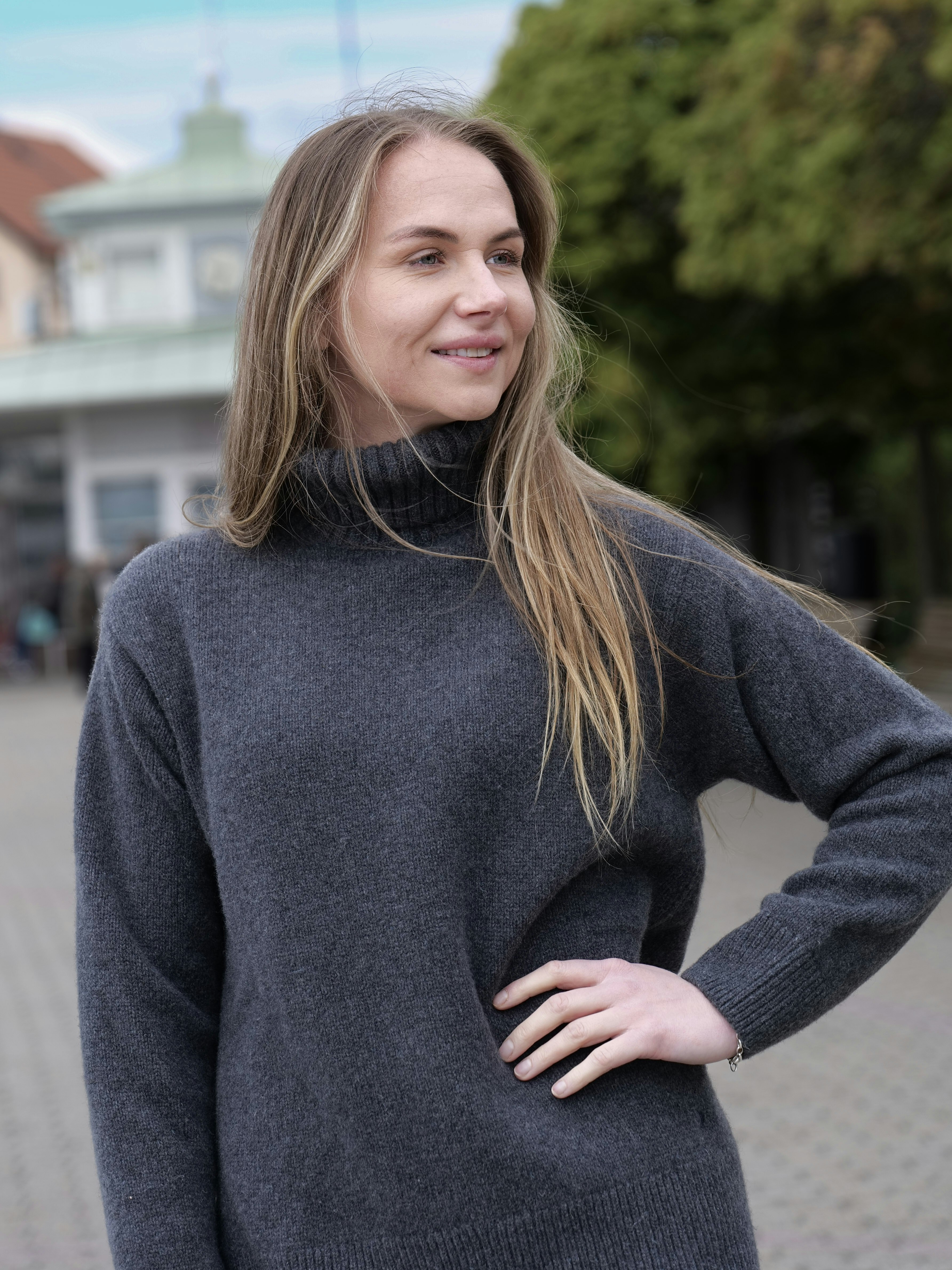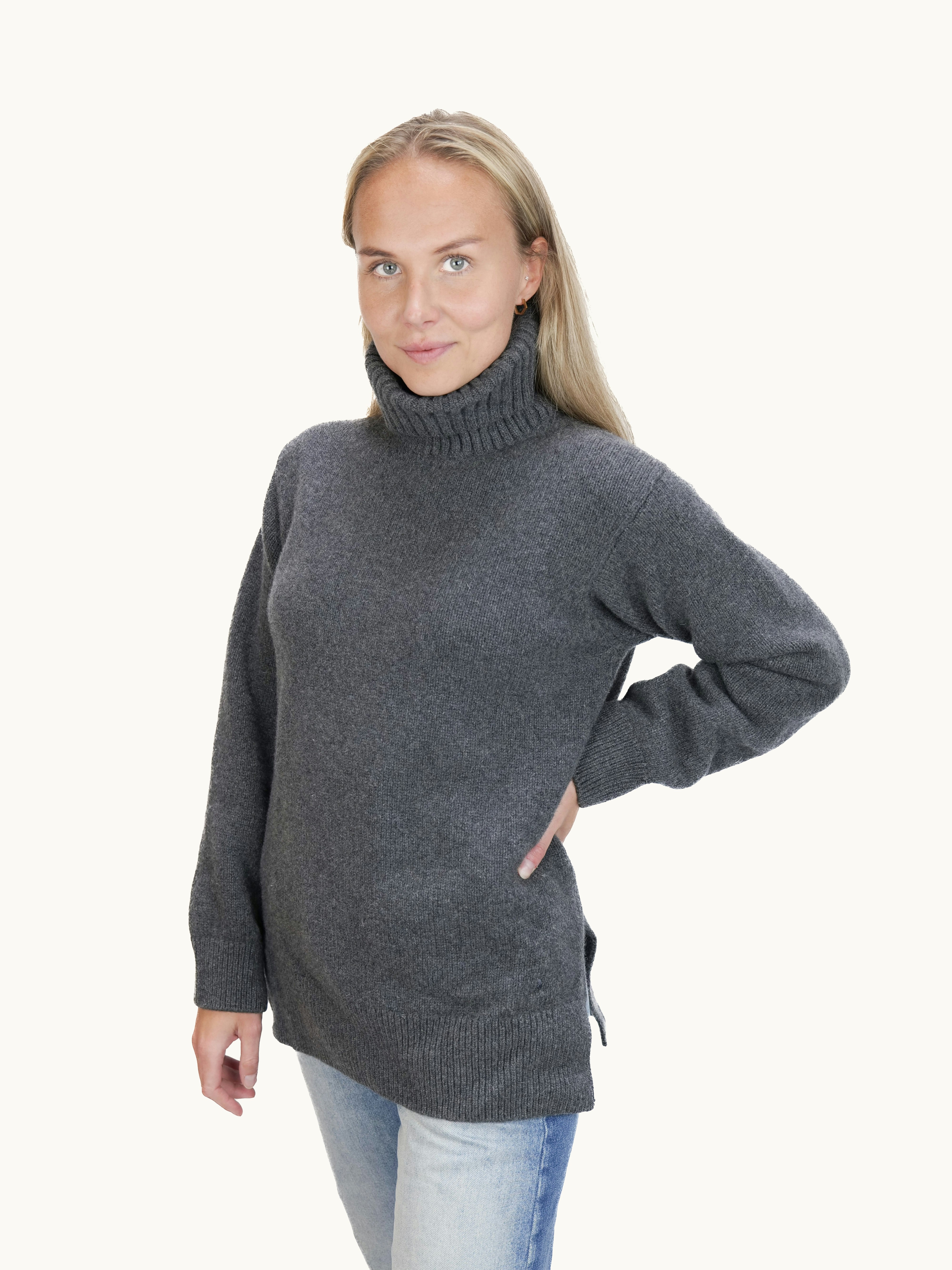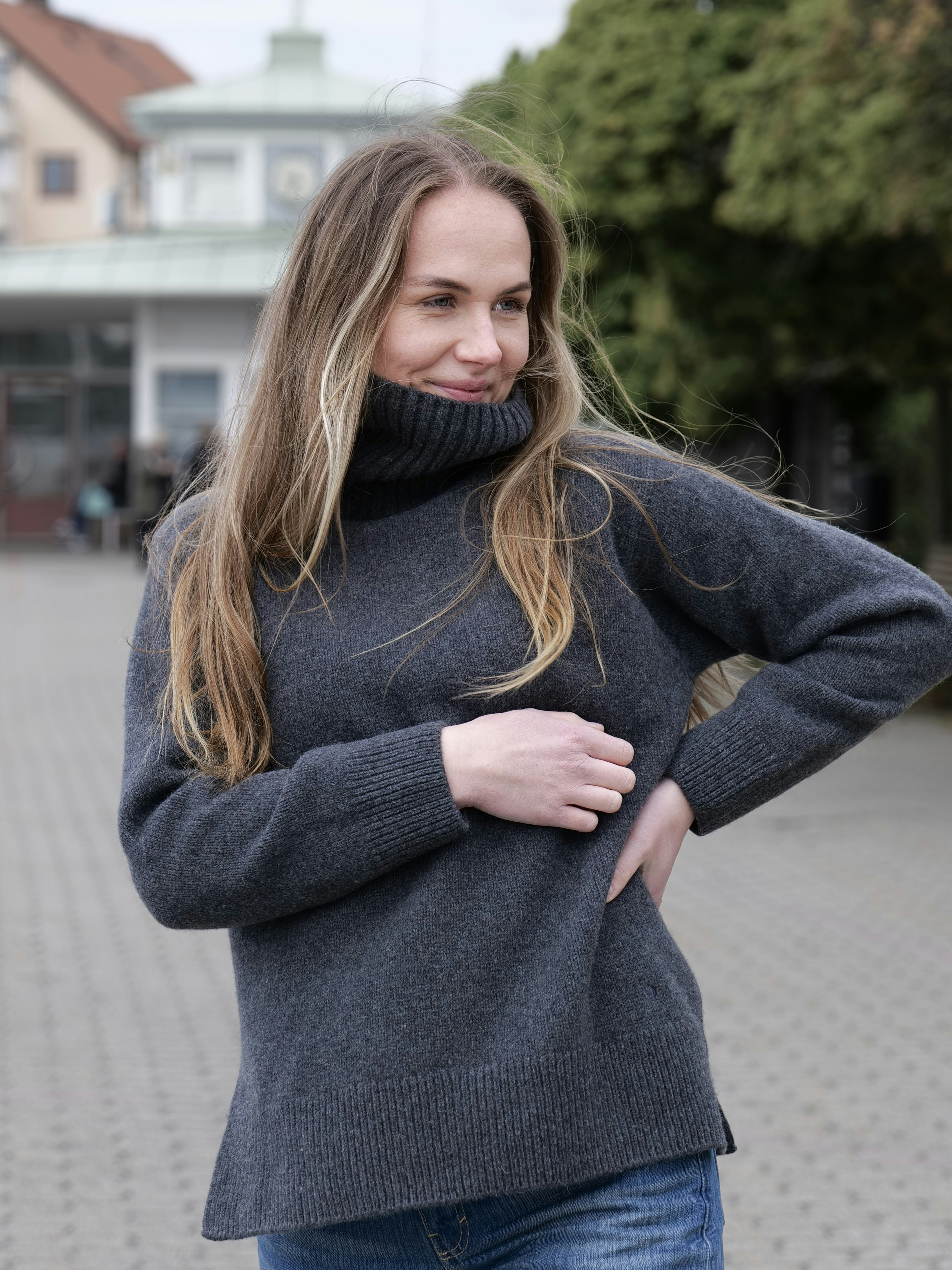 Korkea kaulus voidaan käyttää kahdella tavalla: klassisesti alas käännettynä tai ylös käännettynä, jolloin se lämmittää enemmän ja antaa rennomman ilmeen. Lasketut olkapäät ja leveät, löysät hihansuut antavat villapaidalle pehmeän, rennon siluetin. Ribbineulos sivuilla luo hienovaraisen mutta ilmeikkään yksityiskohdan, kun taas sivuhalkiot ja hieman pidempi takaosa antavat liikkumavapautta ja modernin istuvuuden.