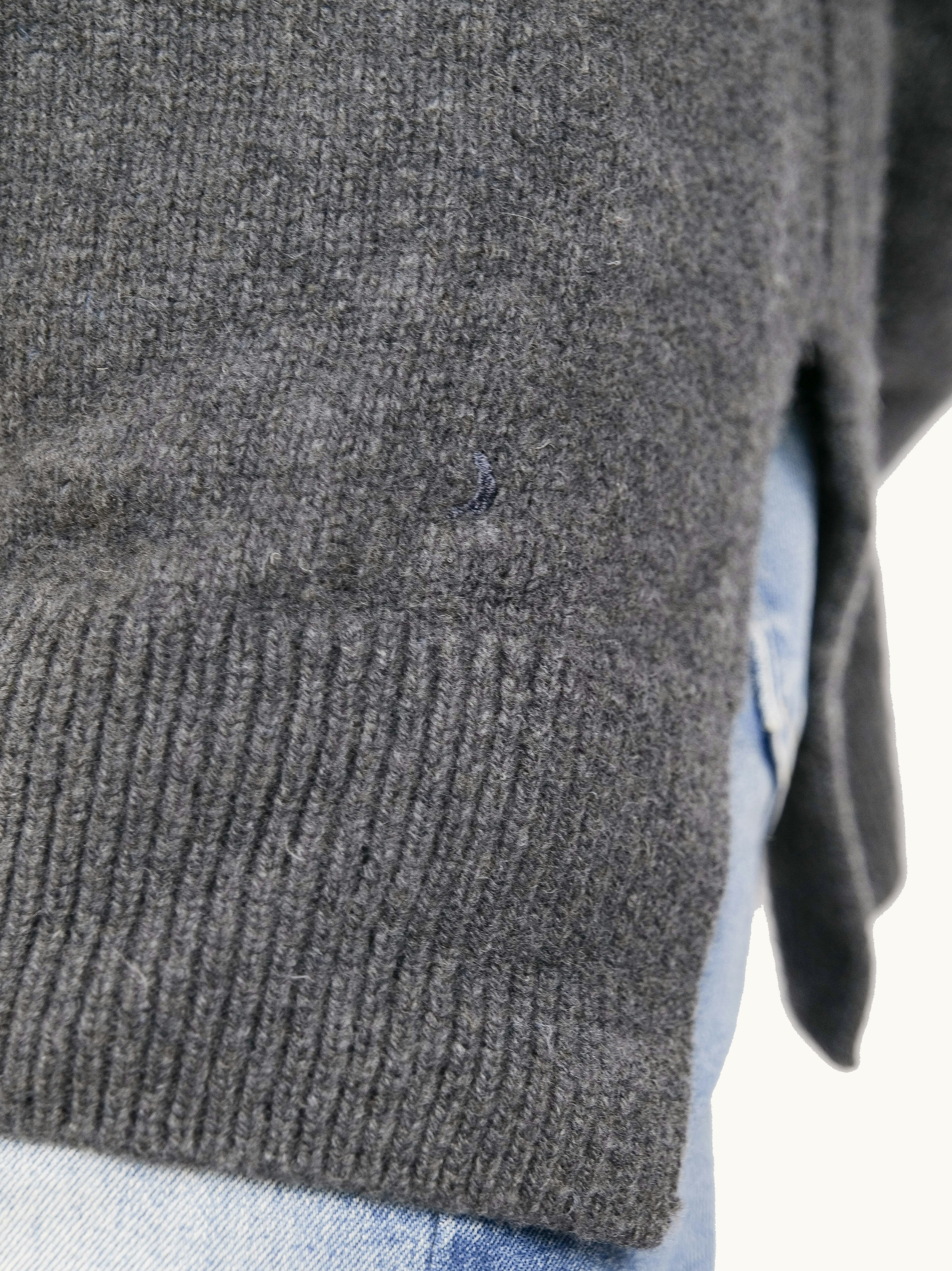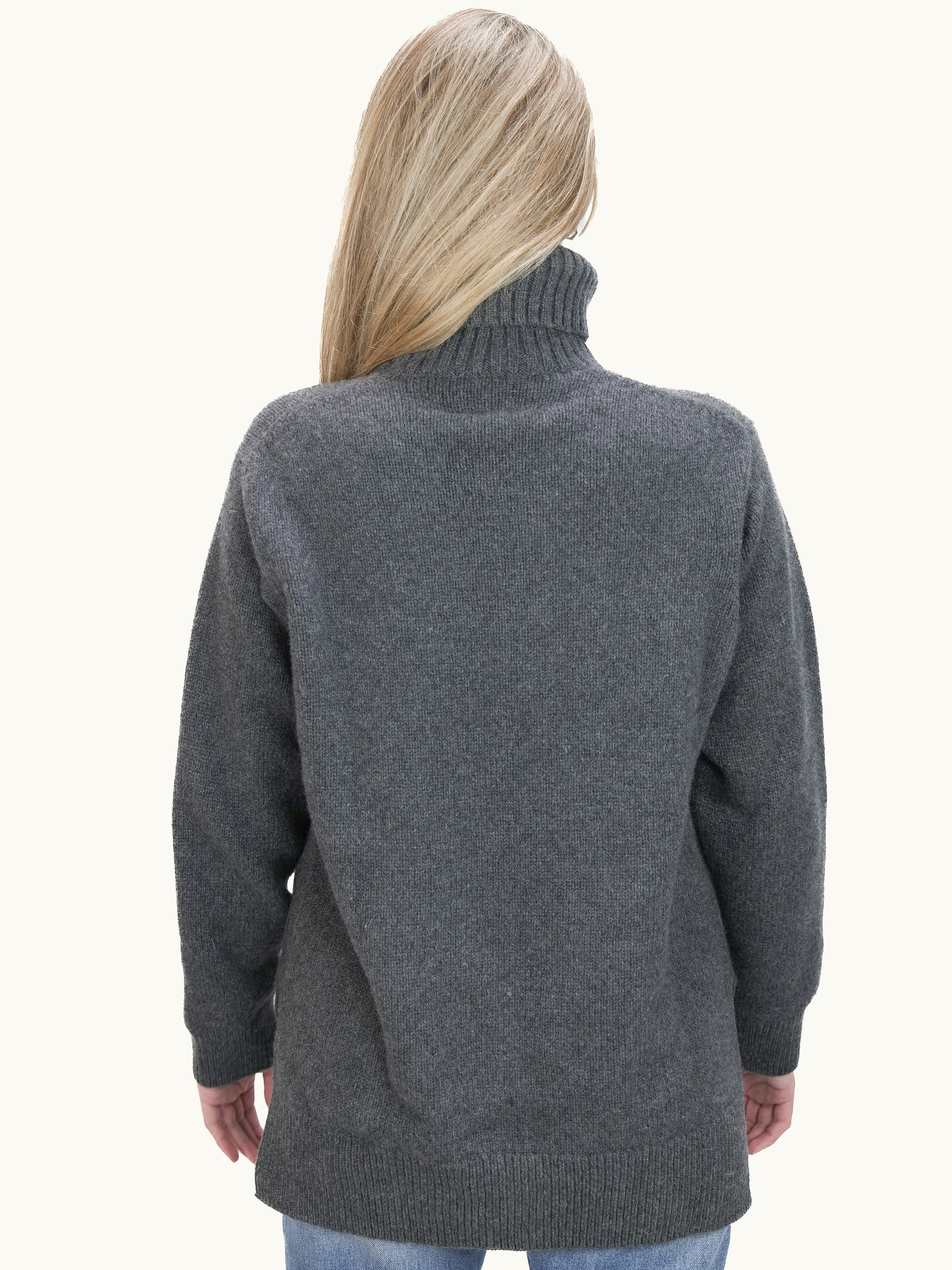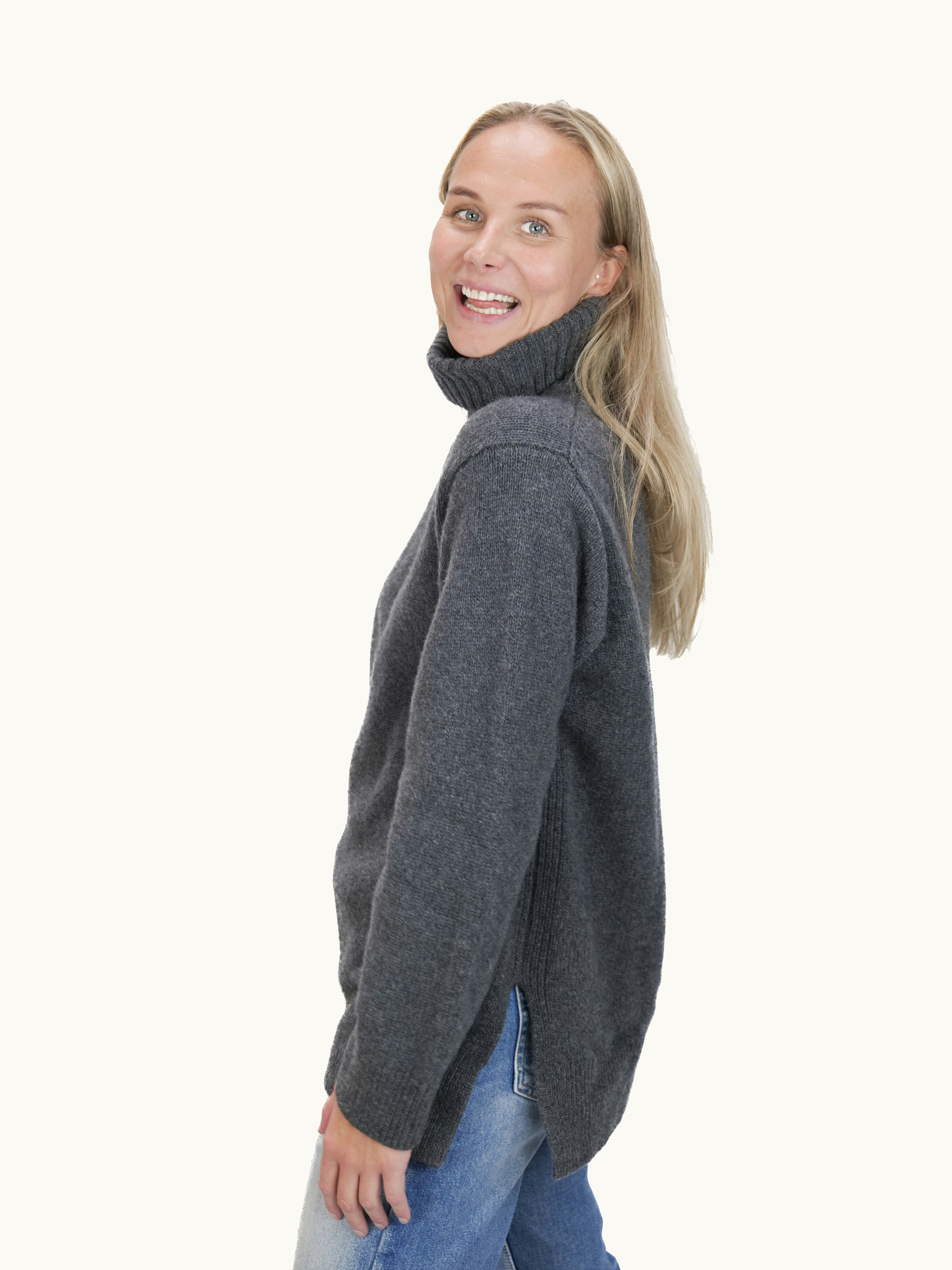 Korkea kaulus voidaan käyttää kahdella tavalla: klassisesti alas käännettynä tai ylös käännettynä, jolloin se lämmittää enemmän ja antaa rennomman ilmeen. Lasketut olkapäät ja leveät, löysät hihansuut antavat villapaidalle pehmeän, rennon siluetin. Ribbineulos sivuilla luo hienovaraisen mutta ilmeikkään yksityiskohdan, kun taas sivuhalkiot ja hieman pidempi takaosa antavat liikkumavapautta ja modernin istuvuuden.