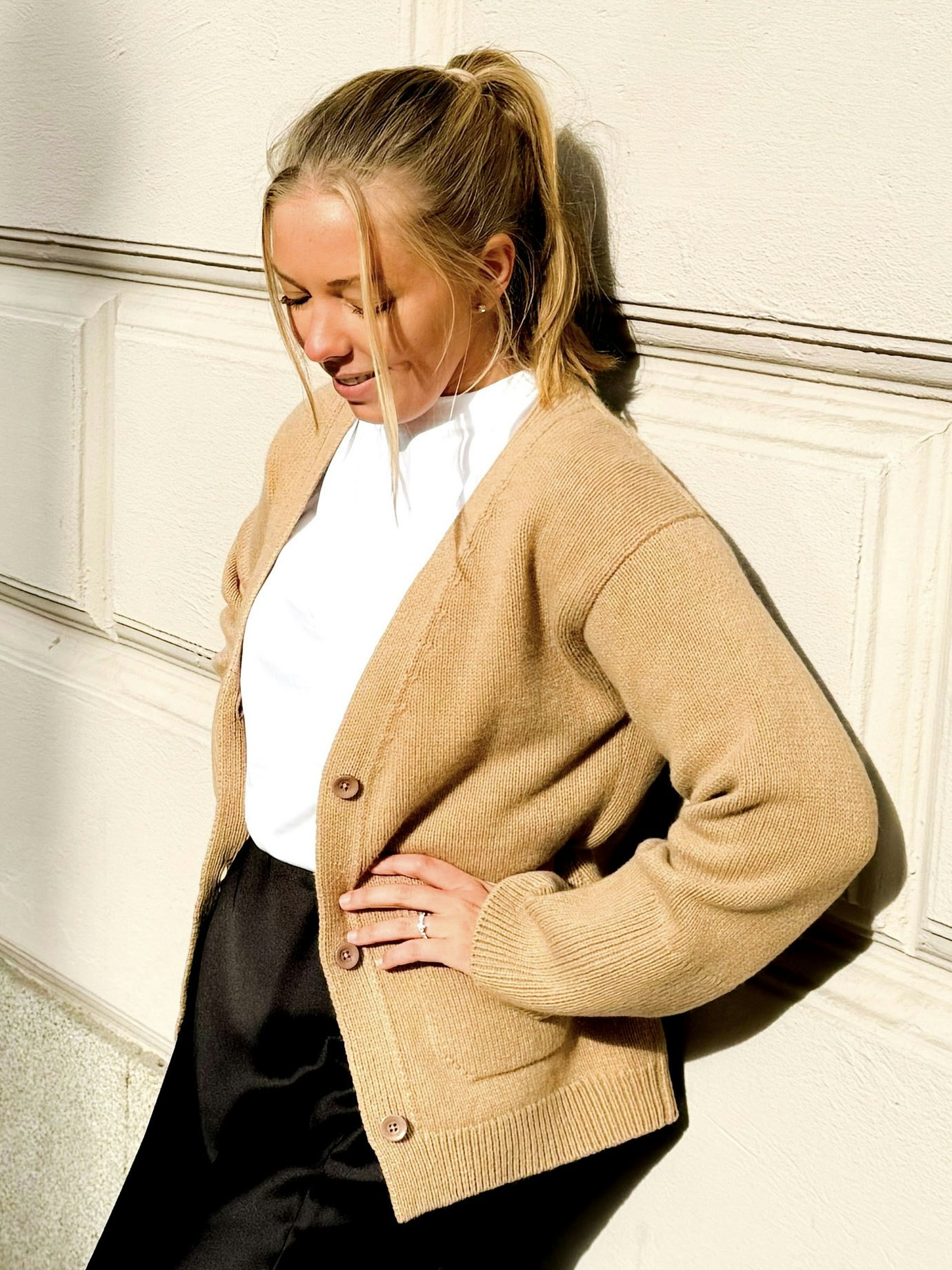 Helgö neuletakki on tyylikäs ja ajaton neuletakki, joka on valmistettu kierrätetystä kashmirista. Neuletakissa on v-pääntie ja hienovarainen resori, joka antaa sille klassisen ja hienostuneen ilmeen. Leveät, löysät hihansuut paidan päissä ja hihansuissa lisäävät mukavaa istuvuutta, ja hihanpäät ovat hieman levennettyjä, mikä lisää eleganssia.