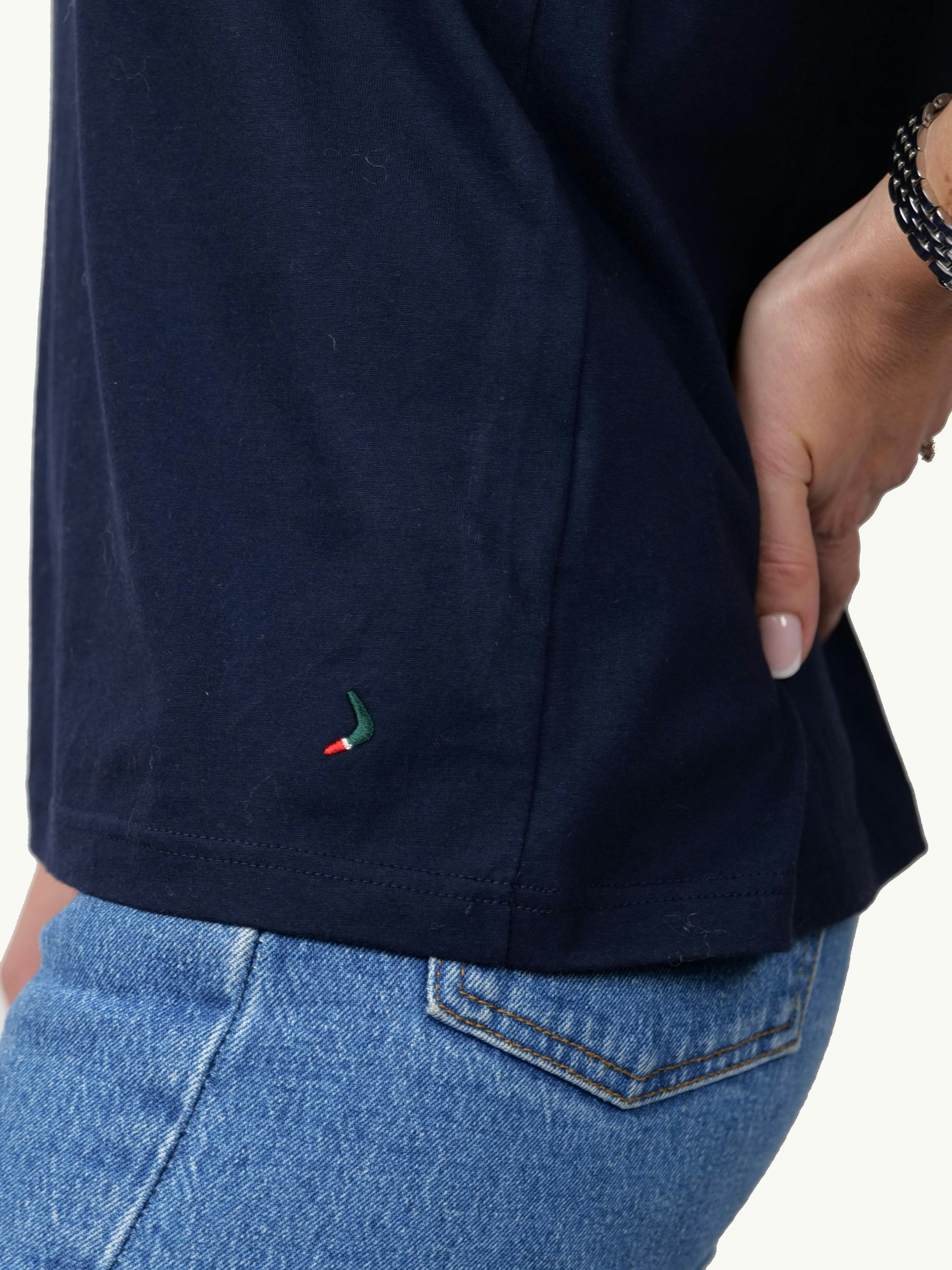 Käringö-paita on neulottu Ruotsissa luomupuuvillasta. Väljä paita tuntuu ohuelta ja pehmeältä. Pääntiessä on leveä resori ja helmassa oikealla puolella kirjailtu Boomerang-logo.