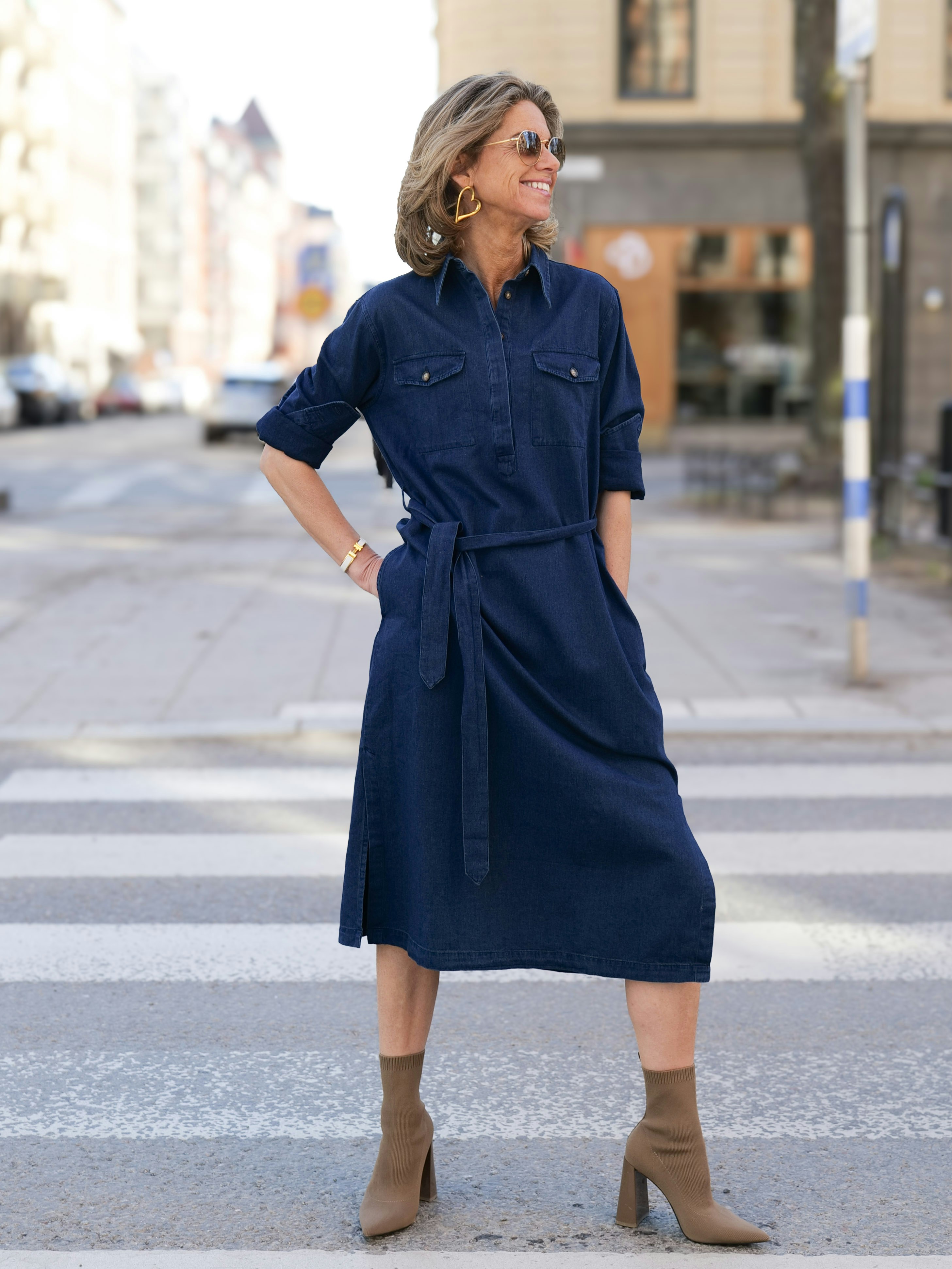 Ljungskär-mekko on valmistettu ohuesta farkkukankaasta, ja siinä on kaksi rintataskua. Istuvuus on suora, ja sivuilla on vyö, joka kiinnitetään vyölenkeillä. Sivuhalkiot antavat mekolle kauniin liikkumisen vapauden.
