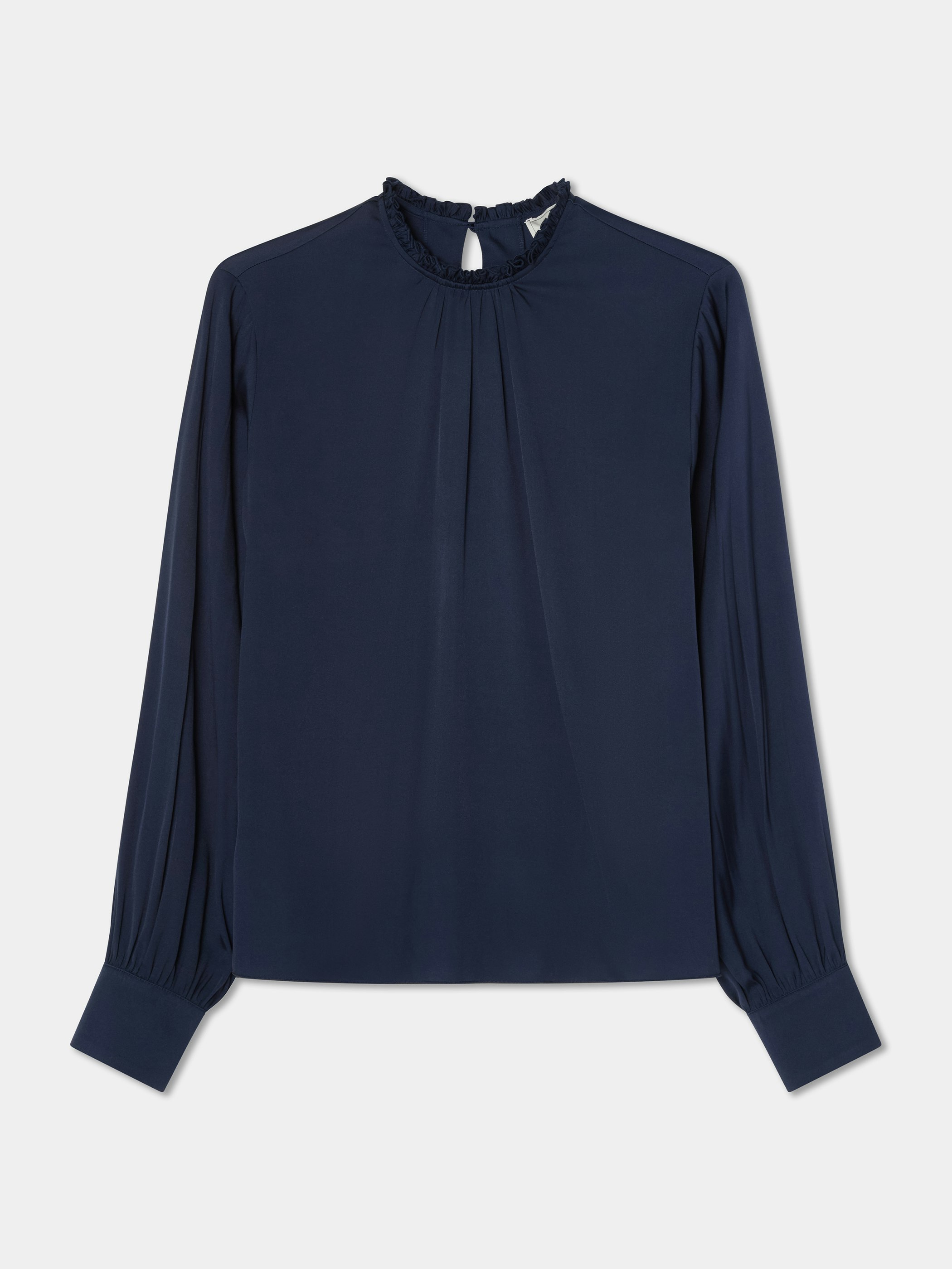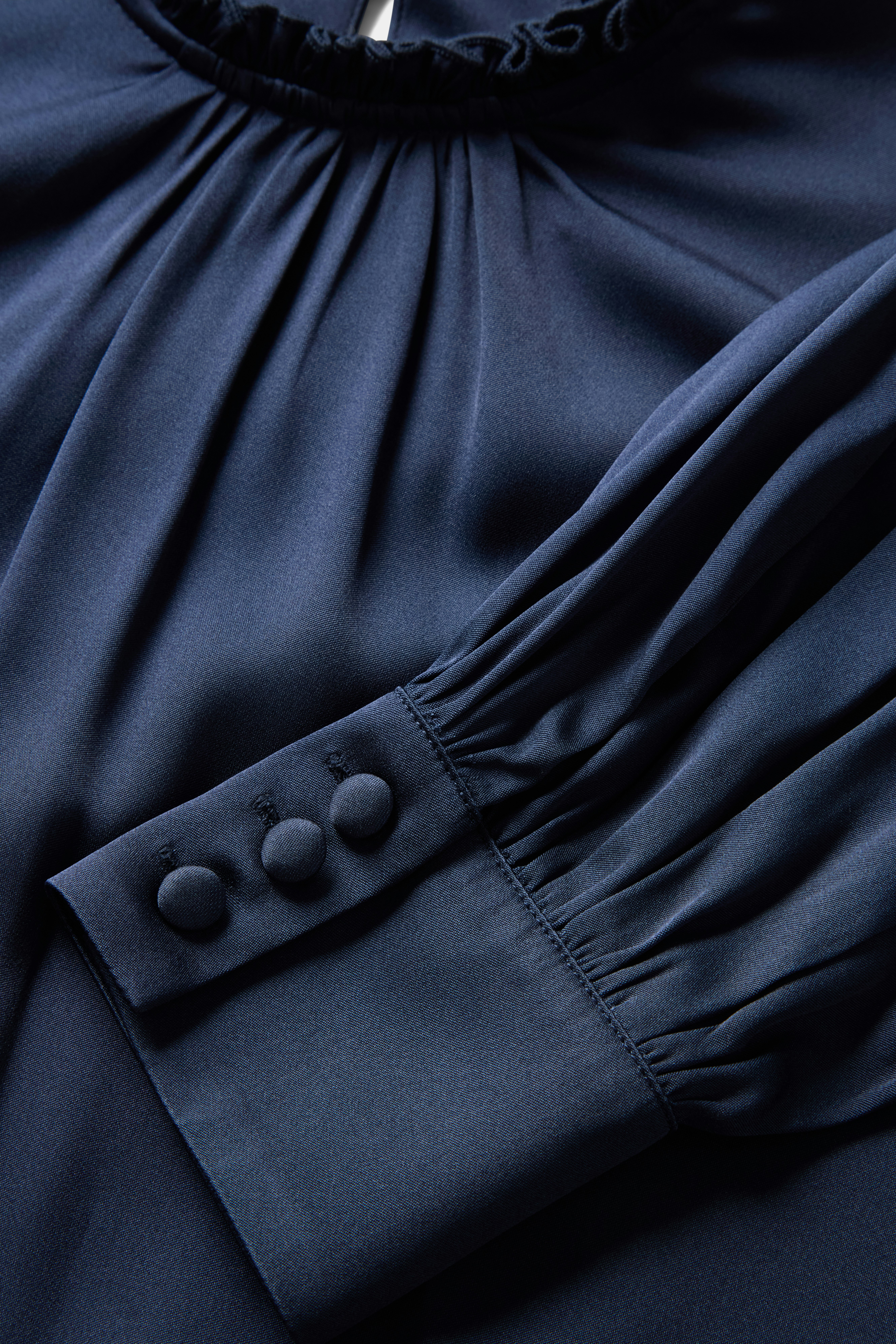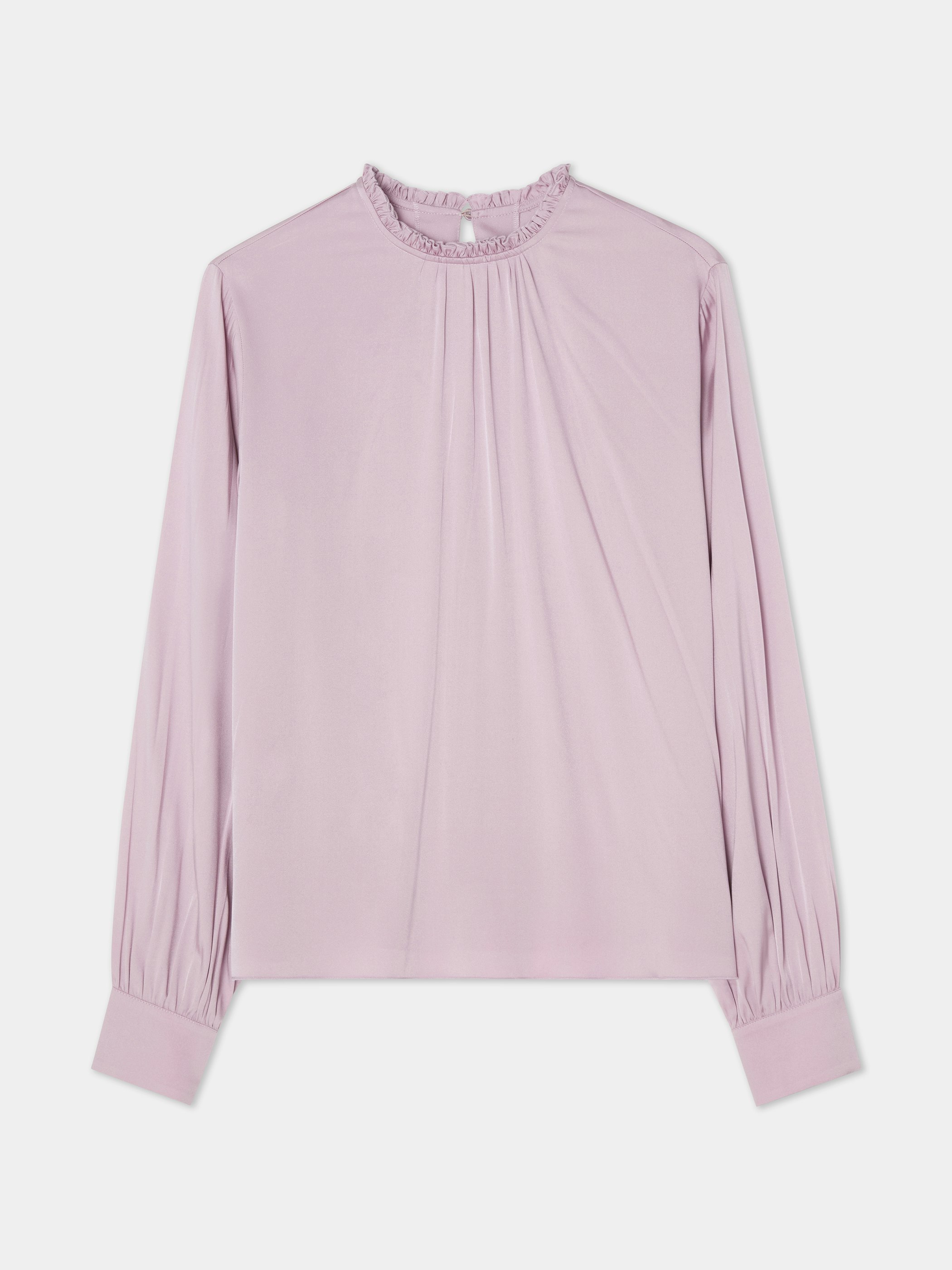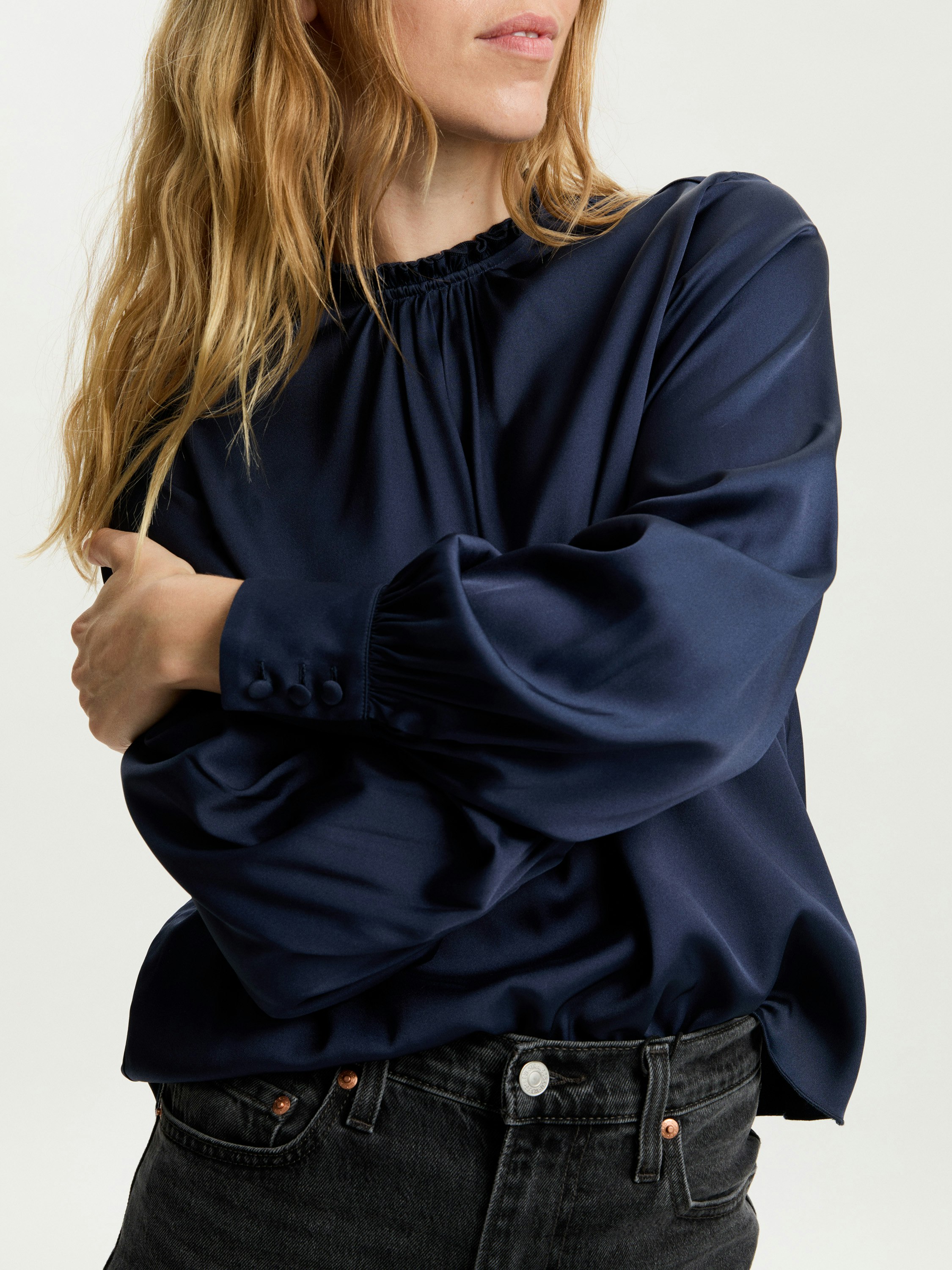 Runnön hihansuut, jotka päättyvät eleganttiin hihansuun, on koristeltu kolmella pukeutuneella napilla, jotka lisäävät tyylikkään yksityiskohdan. Kaulassa on röyhelöinen reuna ja rypytetty pääntie, joka luo pehmeän, naisellisen siluetin. Puseron suora pää saa sen kauniisti putoamaan ja on sekä mukava pukea sisään että käyttää sellaisenaan.